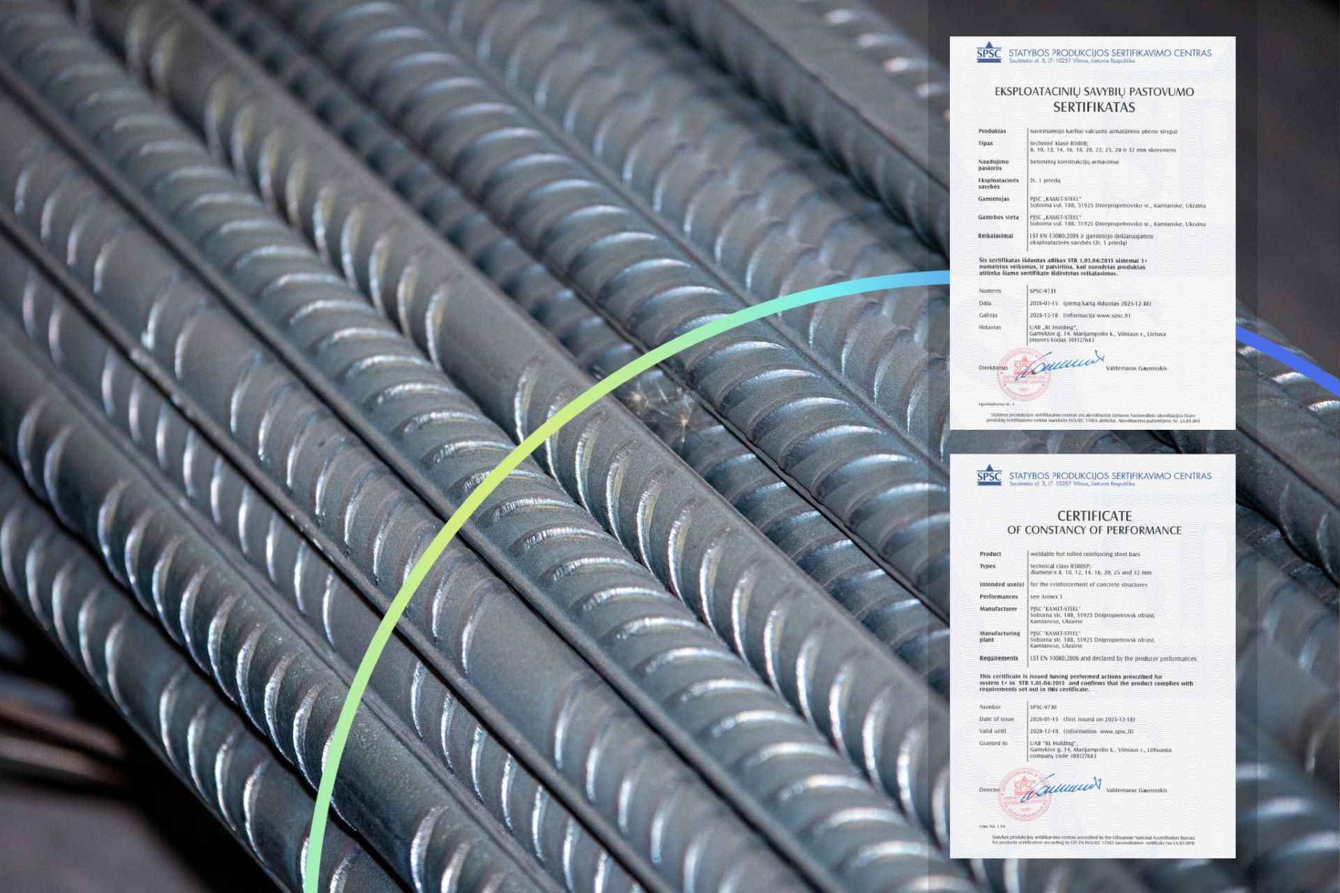 SPSC certified reinforcing steel grades B500SP and B500B in bars with a nominal diameter of 8 to 32 mm, produced on the 400/200 rolling mill of the enterprise. The documents grant the right to supply products to customers in Lithuania in accordance with national standards.